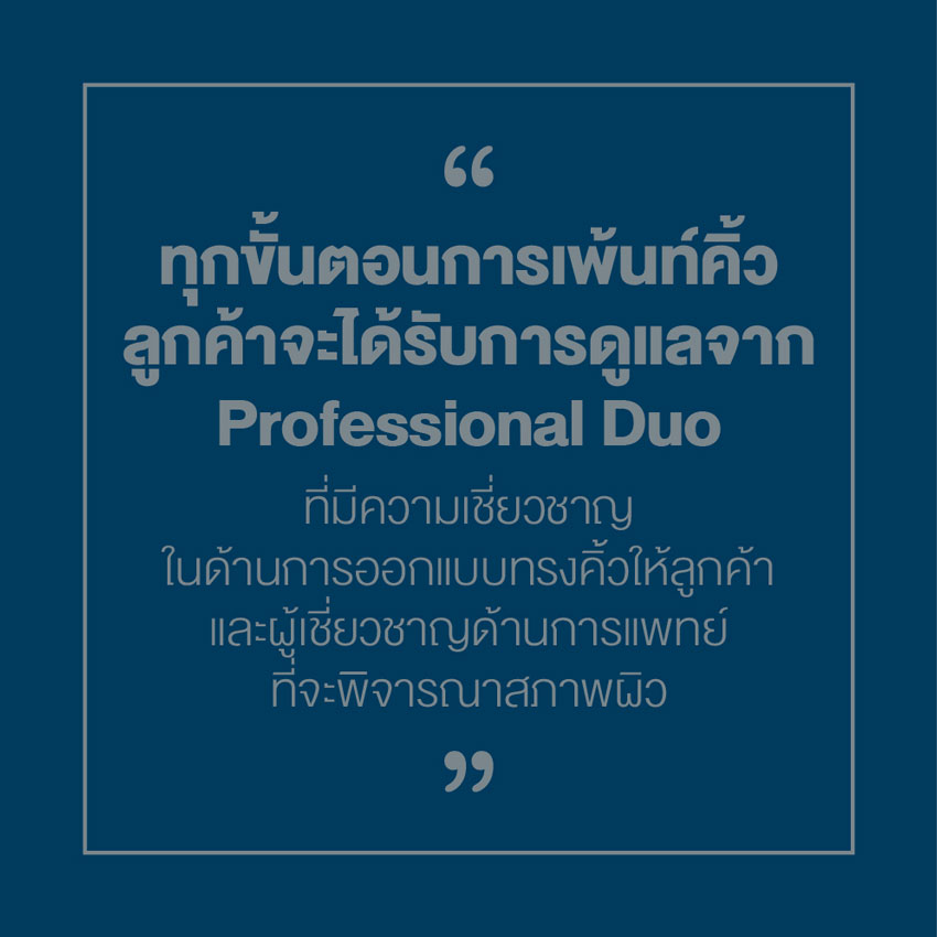 ซึ่งในทุกขั้นตอนการเพ้นท์ค้วของเอดีน่า ลูกค้าจะได้รับการดูแลจาก Professional Duo ที่มีความเชี่ยวชาญในเรื่องศิลปะที่ดูแลด้านการออกแบบทรงคิ้วให้ลูกค้า และผู้เชี่ยวชาญด้านการแพทย์ที่จะพิจารณาสภาพผิว ดูแลผิวบริเวณคิ้วระหว่างทำ และสามารถรวจเช็คความเรียบร้อยได้ตลอดระหว่างเพ้นท์คิ้ว เพื่อให้ลูกค้าได้มีคิ้วที่ดีที่สุดทั้งสวยและสุขภาพผิวไม่ถูกทำร้าย โดยในขั้นตอนการทำคิ้วของเอดีน่านั้นใช้เวลานานถึง 4 ชั่วโมง เพราะเราใส่ใจทุกรายละเอียดในทุกๆ นาทีที่ลูกค้าใช้เวลากับเรา นอกจากนี้หลังการเพ้นท์คิ้ว เรายังพร้อมให้การดูแล แนะนำ และให้คำปรึกษาอย่างสม่ำเสมอ เพื่อให้ลูกค้าได้เป็นเจ้าของคิ้วที่สวยงามอย่างที่ต้องการ
