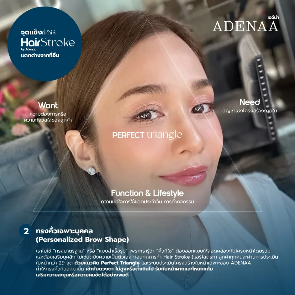 ก่อนทุกการทำ Hair Stroke (แฮร์โสตรก) ลูกค้าทุกคนจะผ่านการประเมินใบหน้ากว่า 29 จุด ด้วยแนวคิด Perfect Triangle และระบบประเมินโครงสร้างใบหน้าเฉพาะของ ADENAA