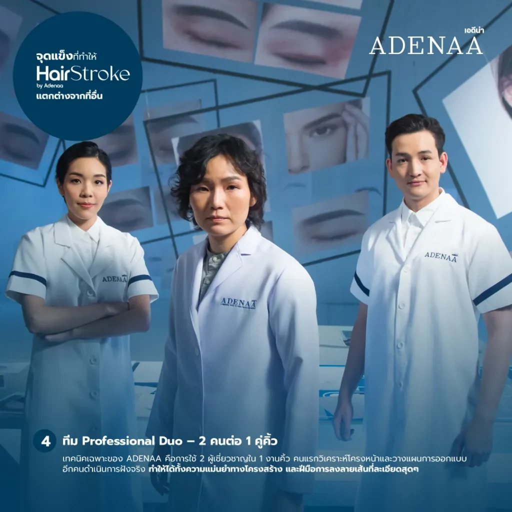 ADENAA ได้นำเทคนิค Hair Stroke (แฮร์โสตรก) นี้มาปรับพัฒนาให้กลายเป็น งานศิลป์ระดับสูงที่ผ่านกระบวนการวิเคราะห์ทางการแพทย์และความงามอย่างลึกซึ้ง ซึ่งเรียกว่า MediArt — ศาสตร์ความงามเฉพาะบุคคลที่ผสานความแม่นยำของการแพทย์กับความงามของศิลปะ