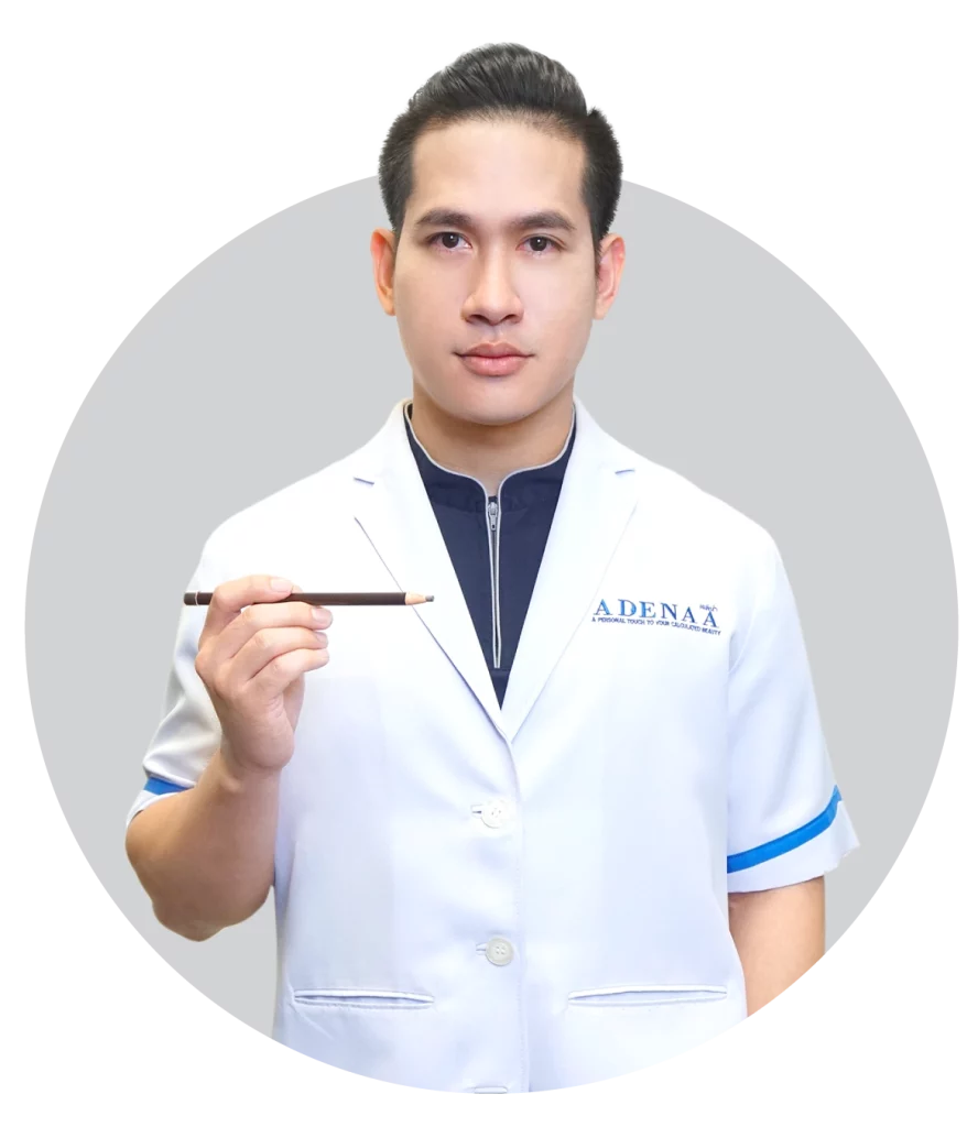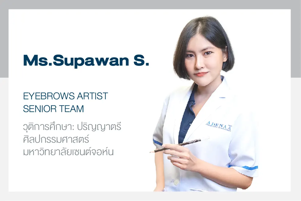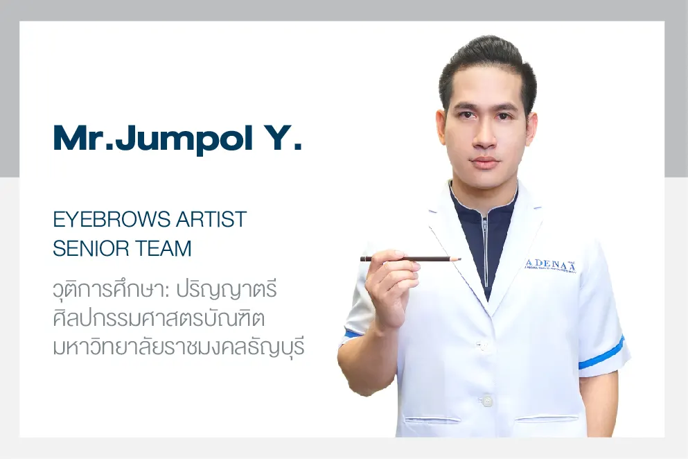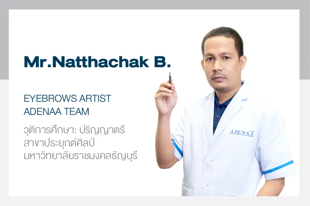 The eyebrow designer uses the Golden Ratio principle along with the science of light and shadow in the design. Adenaro is skilled and designed using advanced techniques to calculate and evaluate the internal and external structures of the face such as bones, vertical and horizontal muscles. Muscles used to express individual facial expressions and emotions. subcutaneous fat layer Characteristics of wrinkles Sagging, facial features, facial shape, characteristics of each person's eyebrows. The direction of hair growth, various problems and limitations, etc. and is a person who has graduated specifically in painting or fine arts. Have basic knowledge in anatomy and art.