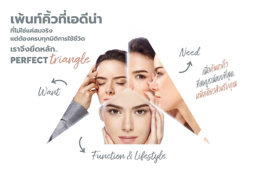 หน้าที่การงาน และอื่นๆ อย่างครอบคลุม เมื่อได้คิ้วที่เหมาะกับพื้นฐานใบหน้า ตอบโจทย์ทุกความต้องการ แต่ถ้าไม่สามารถส่งเสริมการใช้ชีวิตประจำวันของแต่ละคนได้ ก็คงจะถือว่าเป็นคิ้วที่สมบูรณ์แบบไม่ได้ เช่น ลูกค้าบางท่านทำงานให้ตำแหน่งที่ต้องอาศัยความน่าเชื่อถือ หรือบางท่านมีไลฟ์สไตล์ที่ปกติไม่แต่งหน้าจัด เน้นเปลือยผิวหน้า ทีมผู้เชี่ยวชาญก็ต้องนำข้อมูลเหล่านี้มาพิจารณาร่วมเพื่อหาคิ้วที่เข้ากับไลฟ์สไตล์ของคุณ เช่น อาจจะต้องปรับให้คิ้วดูเข้มขึ้นเล็กน้อยเพื่อให้ดูจริงจังน่าเชื่อถือ หรือปรับความหนักเบาของการลงสีเพื่อให้คิ้วดูเป็นธรรมชาติไม่โดดเวลาโชว์หน้าสดนั่นเอง